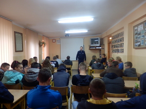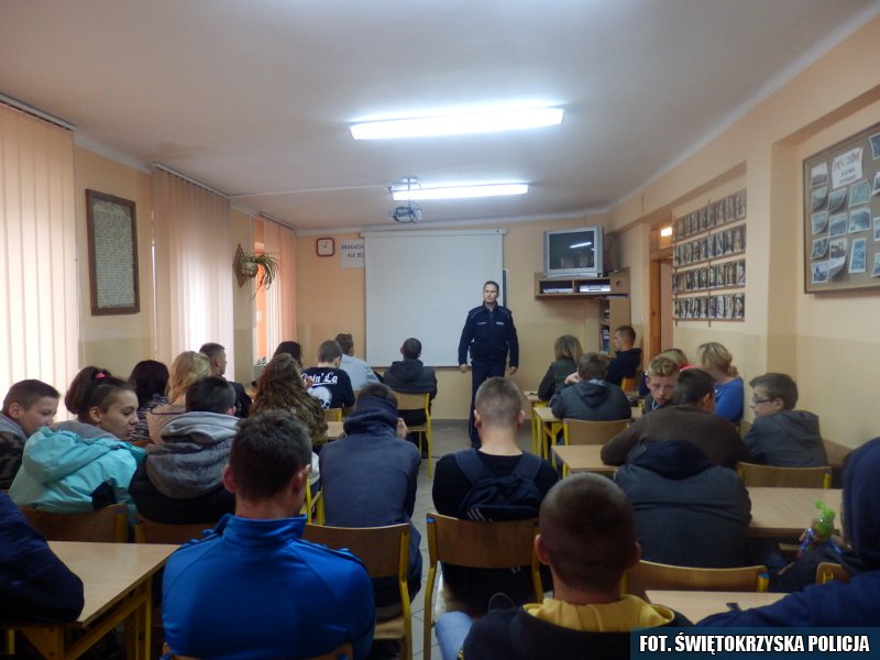 Jak co roku krótko po rozpoczęciu roku szkolnego policjanci z Komendy Powiatowej Policji w Pińczowie spotykają się z uczniami gimnazjum i klas zawodowych, aby zwrócić uwagę młodych ludzi na zagrożenia na jakie mogą być narażeni w środowisku rówieśniczym. Mundurowy w szczególny sposób podkreślił tematykę uzależnień od takich używek jak alkohol, nikotyna, narkotyki i dopalacze. Zwrócił uwagę na przestępstwa popełniane pod wpływem substancji odurzających lub takie, które nierzadko popełniają osoby uzależnione po to by wejść w ich posiadanie. Wyjaśnił również na czy polega różnica pomiędzy narkotykami a dopalaczami.