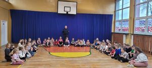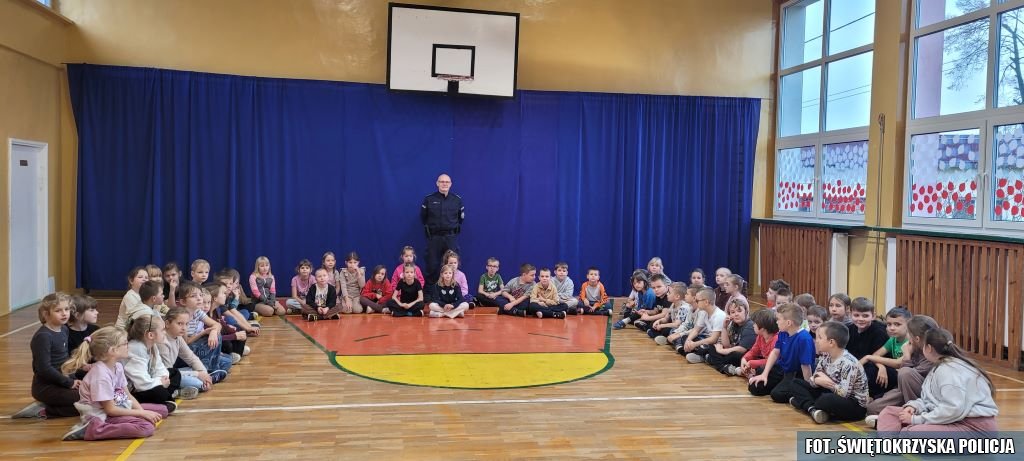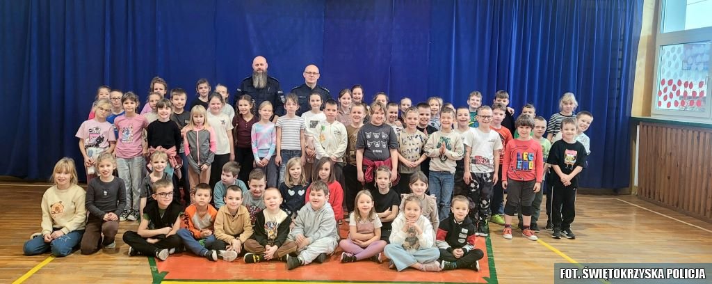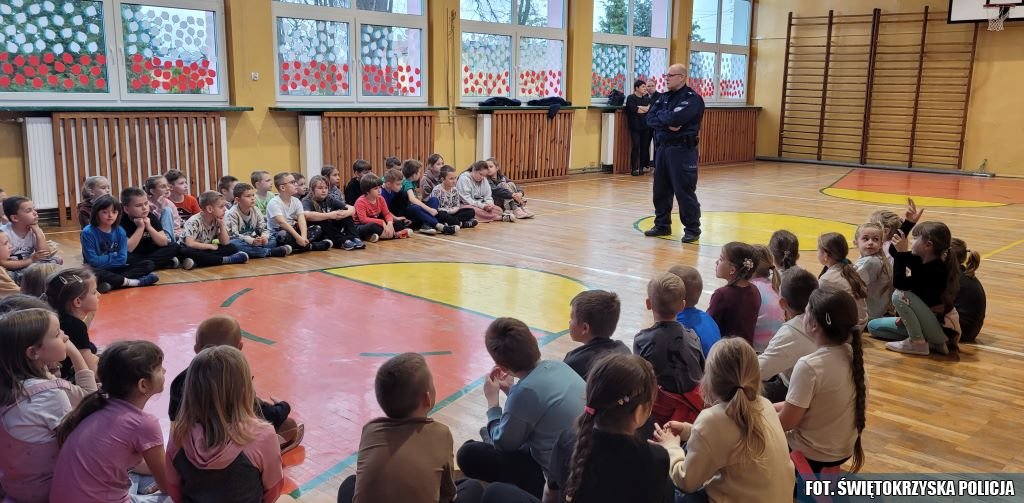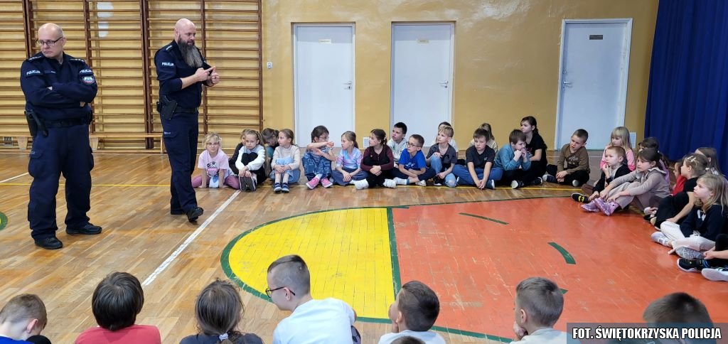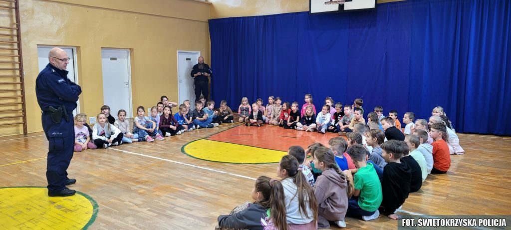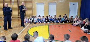 Z młodszymi dziećmi policjanci rozmawiali o zasadach bezpiecznego poruszania się po drodze, właściwym zachowaniu w kontaktach z obcymi osobami, a także o tym, dlaczego tak ważne jest informowanie dorosłych o każdej niepokojącej sytuacji. Uczniowie aktywnie uczestniczyli w zajęciach, chętnie odpowiadali na pytania i brali udział w krótkich ćwiczeniach dotyczących bezpieczeństwa.