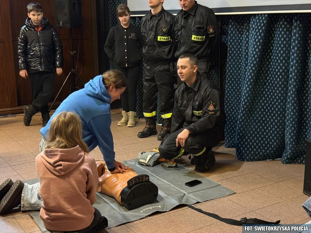 Dodatkowo w wydarzeniu udział wzięli strażacy z Państwowej Straży Pożarnej, którzy omówili zasady udzielania pierwszej pomocy w sytuacjach mogących wystąpić zimą, takich jak załamanie lodu czy zagrożenie utonięciem. Dzieci dowiedziały się, jak prawidłowo reagować i gdzie szukać pomocy, aby nie narażać własnego zdrowia i życia.